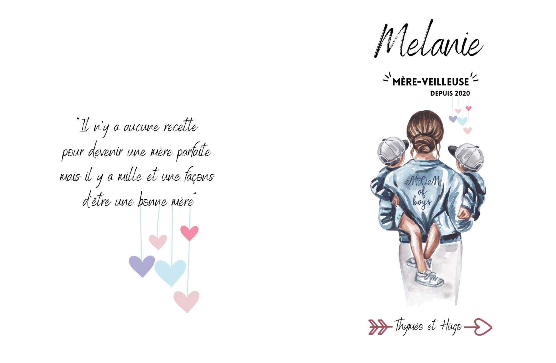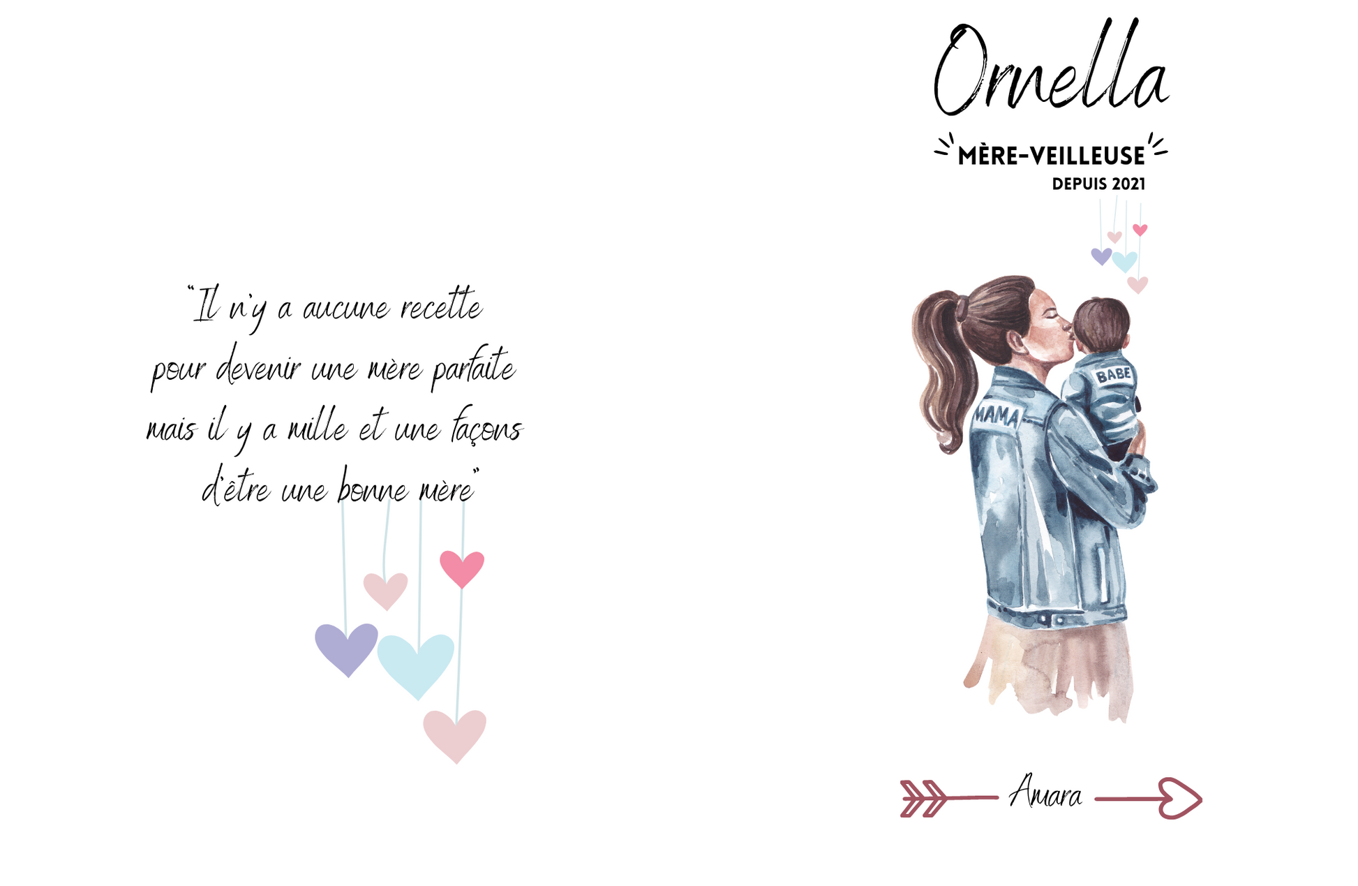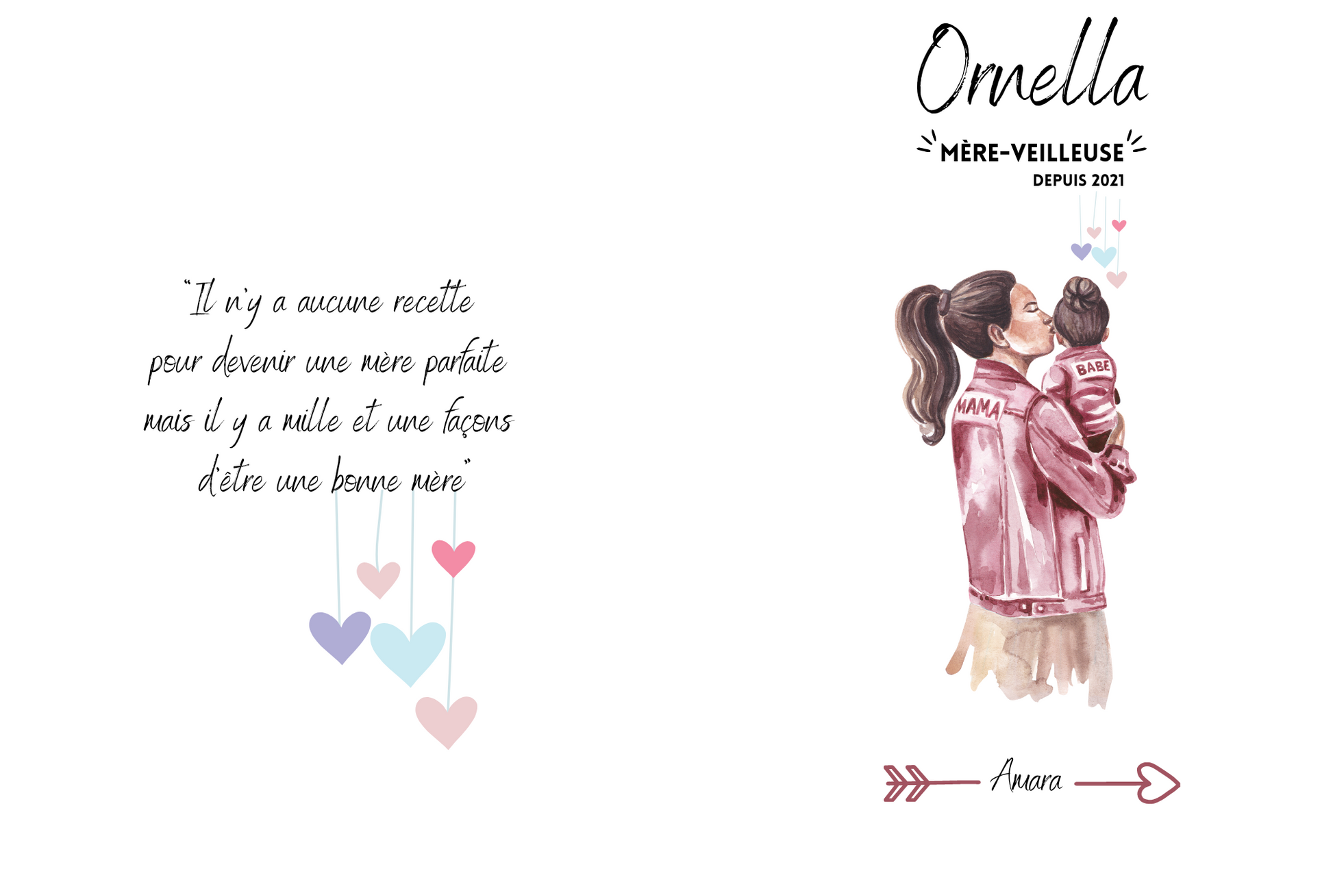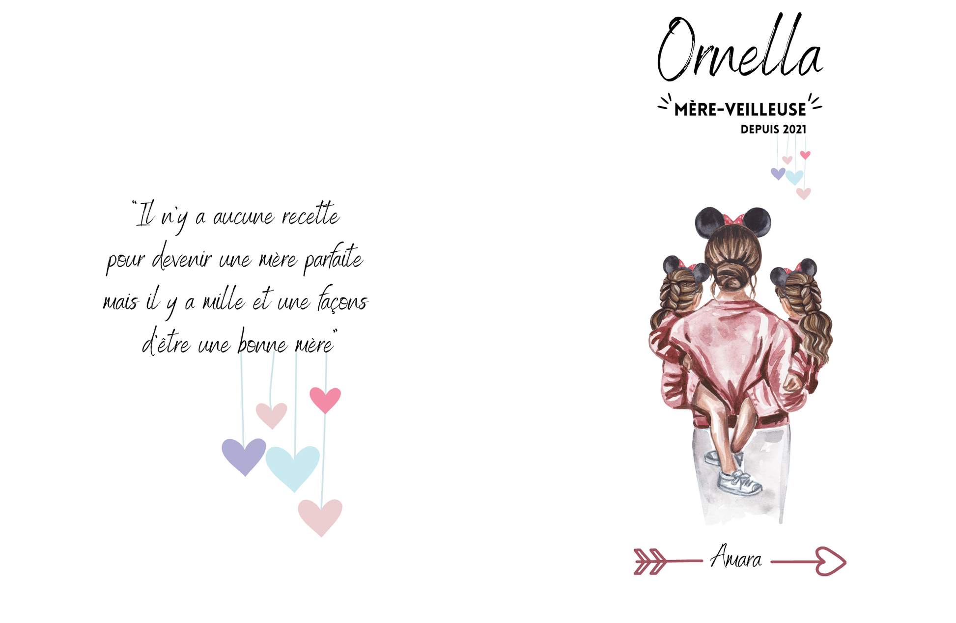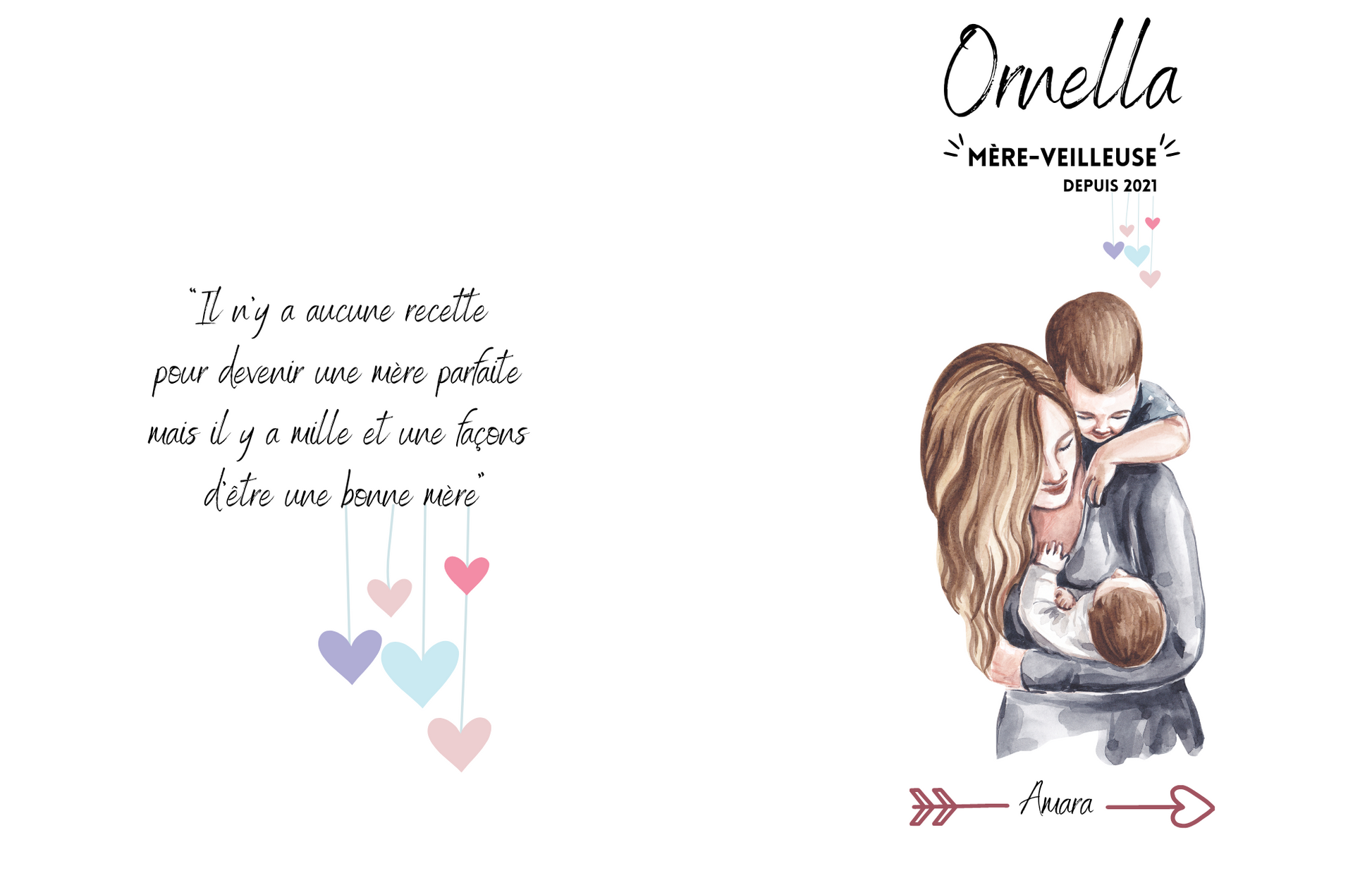 - Design « Mère-veilleuse » : prénom de la maman, l'année où elle est devenue maman pour la première fois et le ou les prénoms de ses enfants