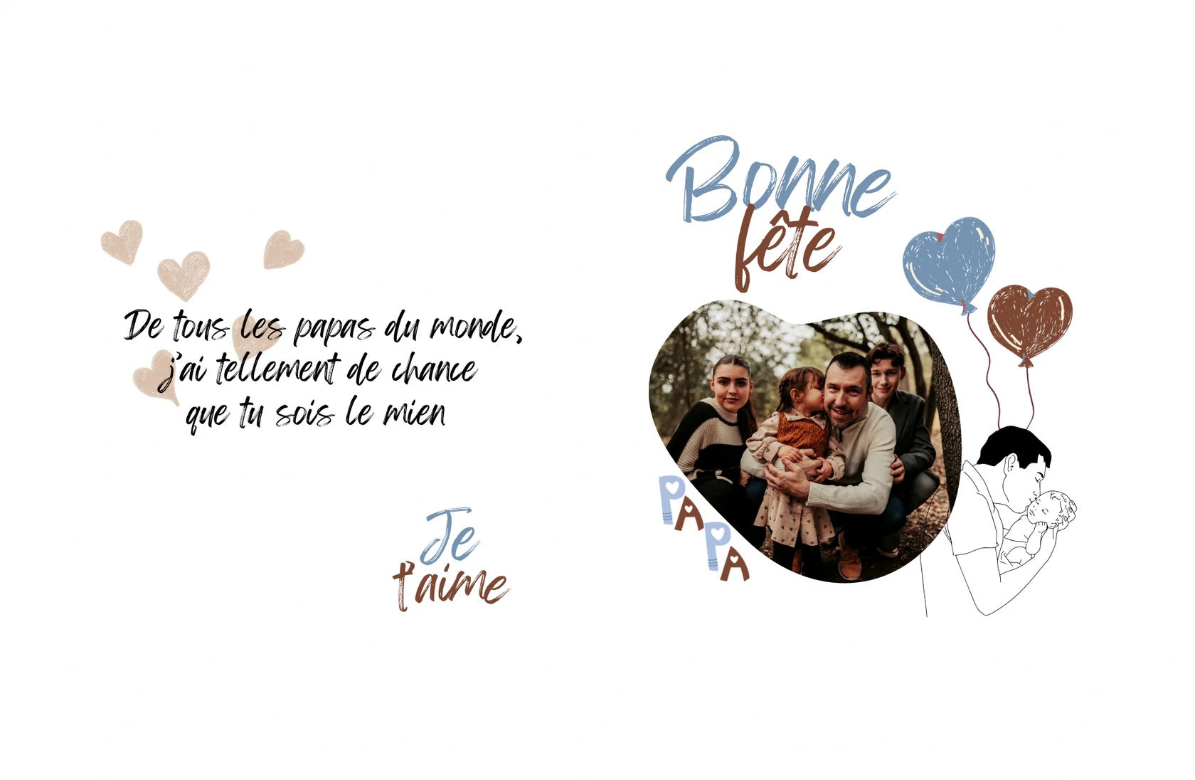- Fête des pères : design personnalisable avec une photo, vous pouvez aussi mettre le texte que vous souhaitez au verso, si celui par défaut ne vous plait pas. Dans ce cas, il faut remplir la zone de texte prévue.