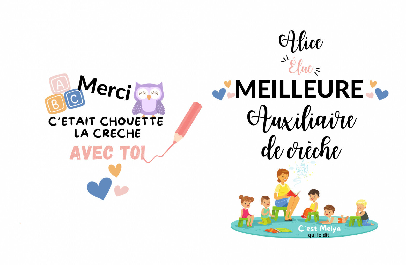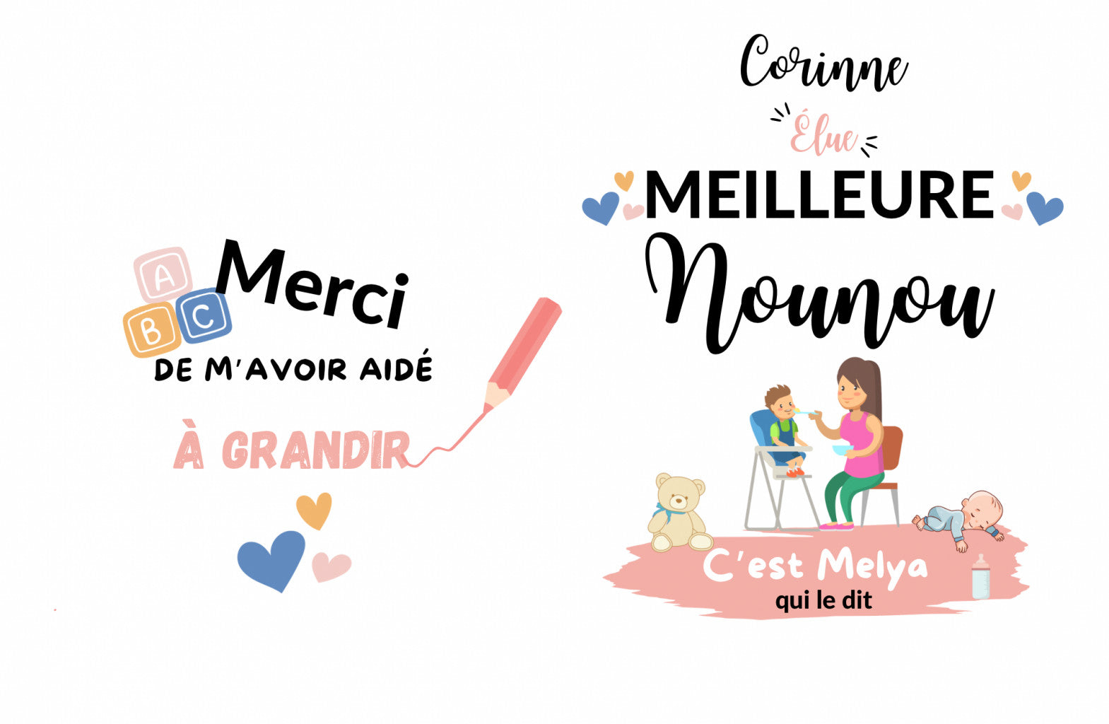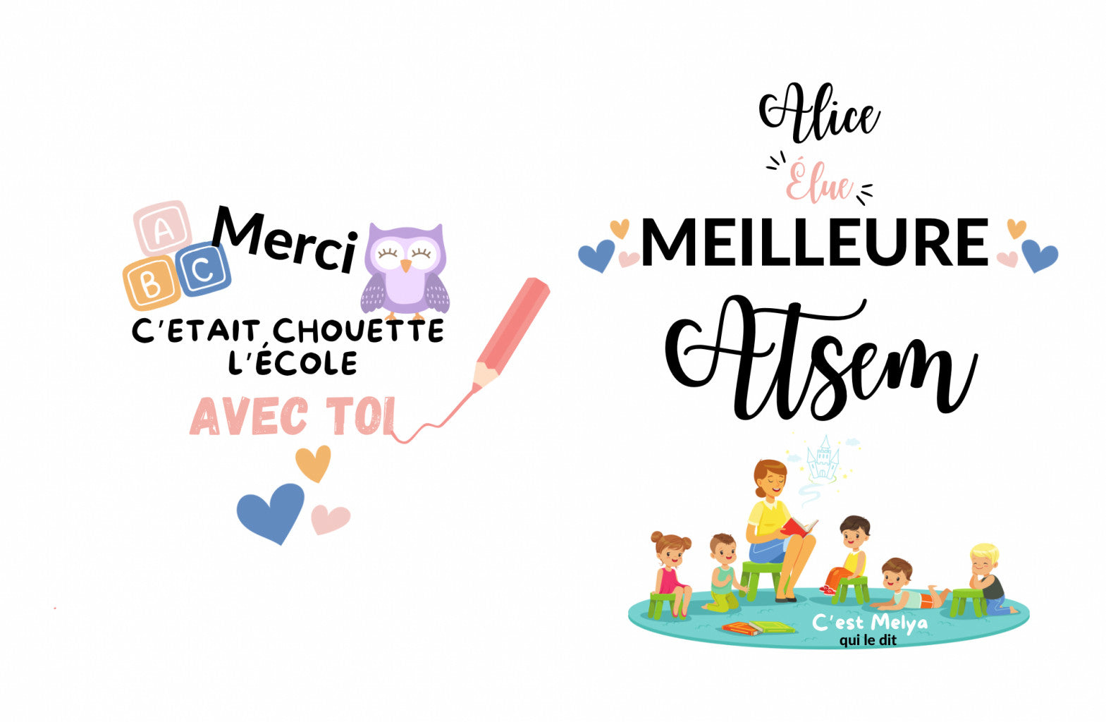 Design fin d’année : préciser le prénom de la personne concernée (nounou, maitresse, astem etc…) ou le nom de l’établissement (nom de la crèche par exemple) puis préciser le nom de l’enfant pour remplir la rubrique « C’est {votre enfant} qui le dit »