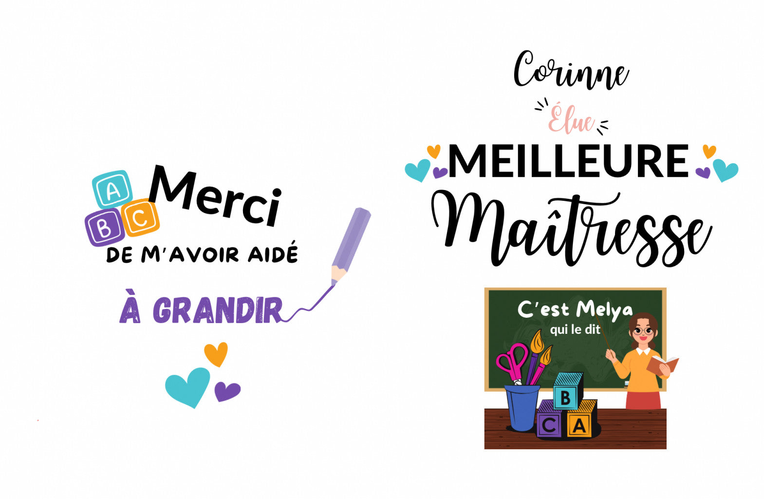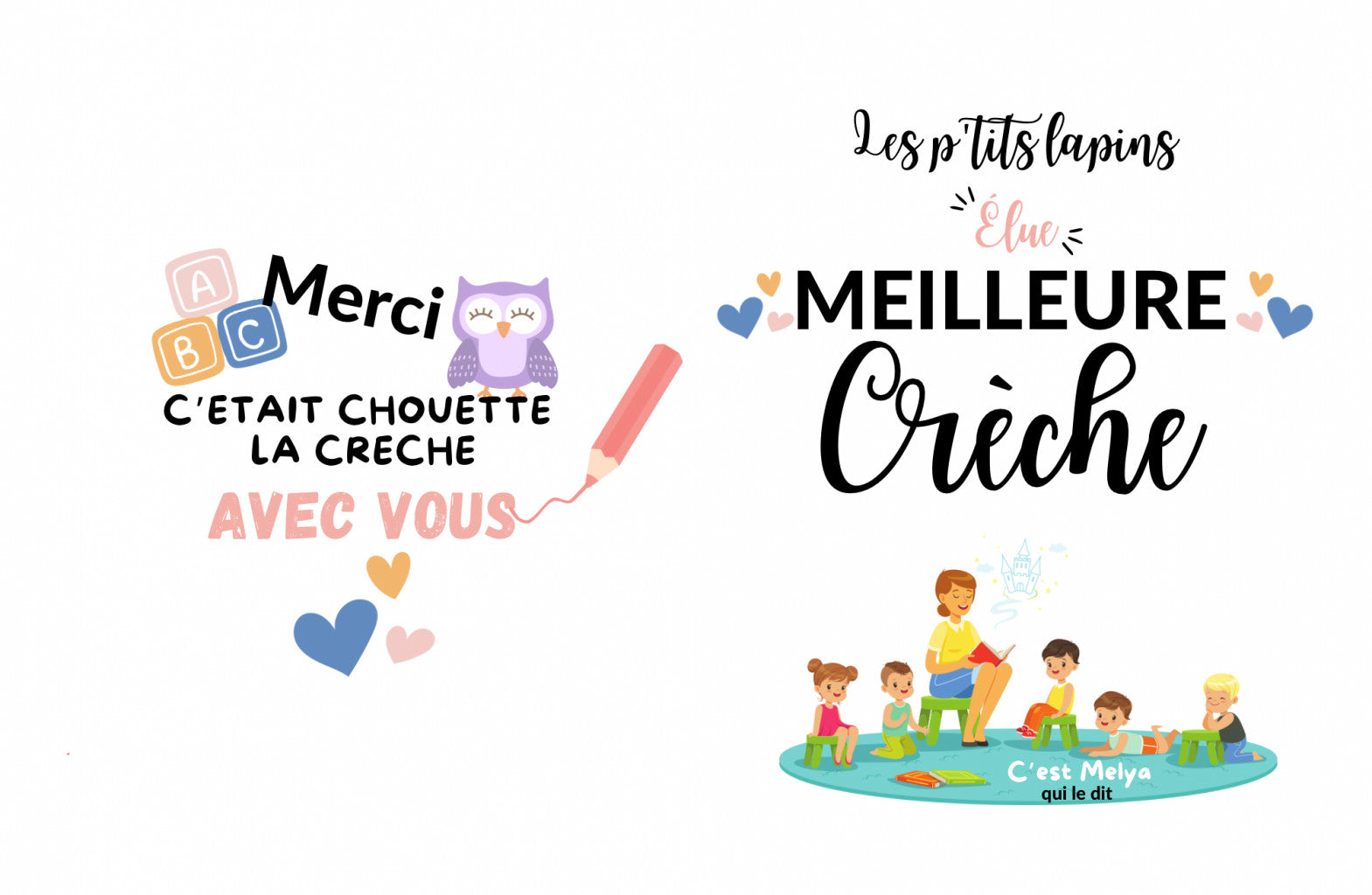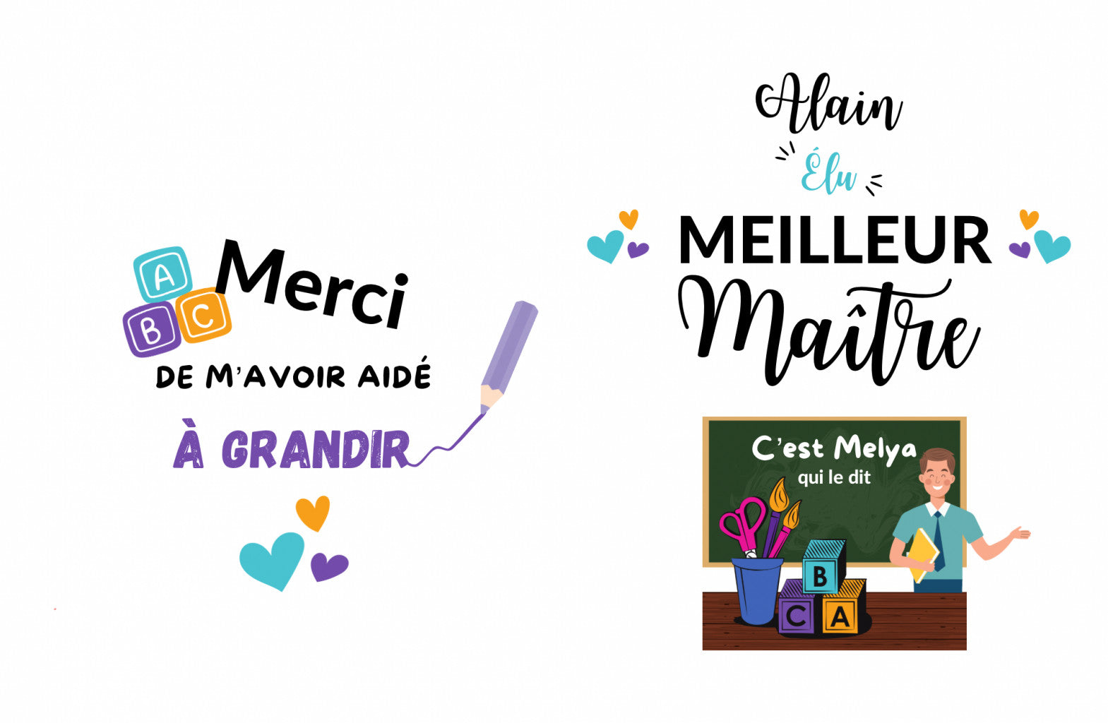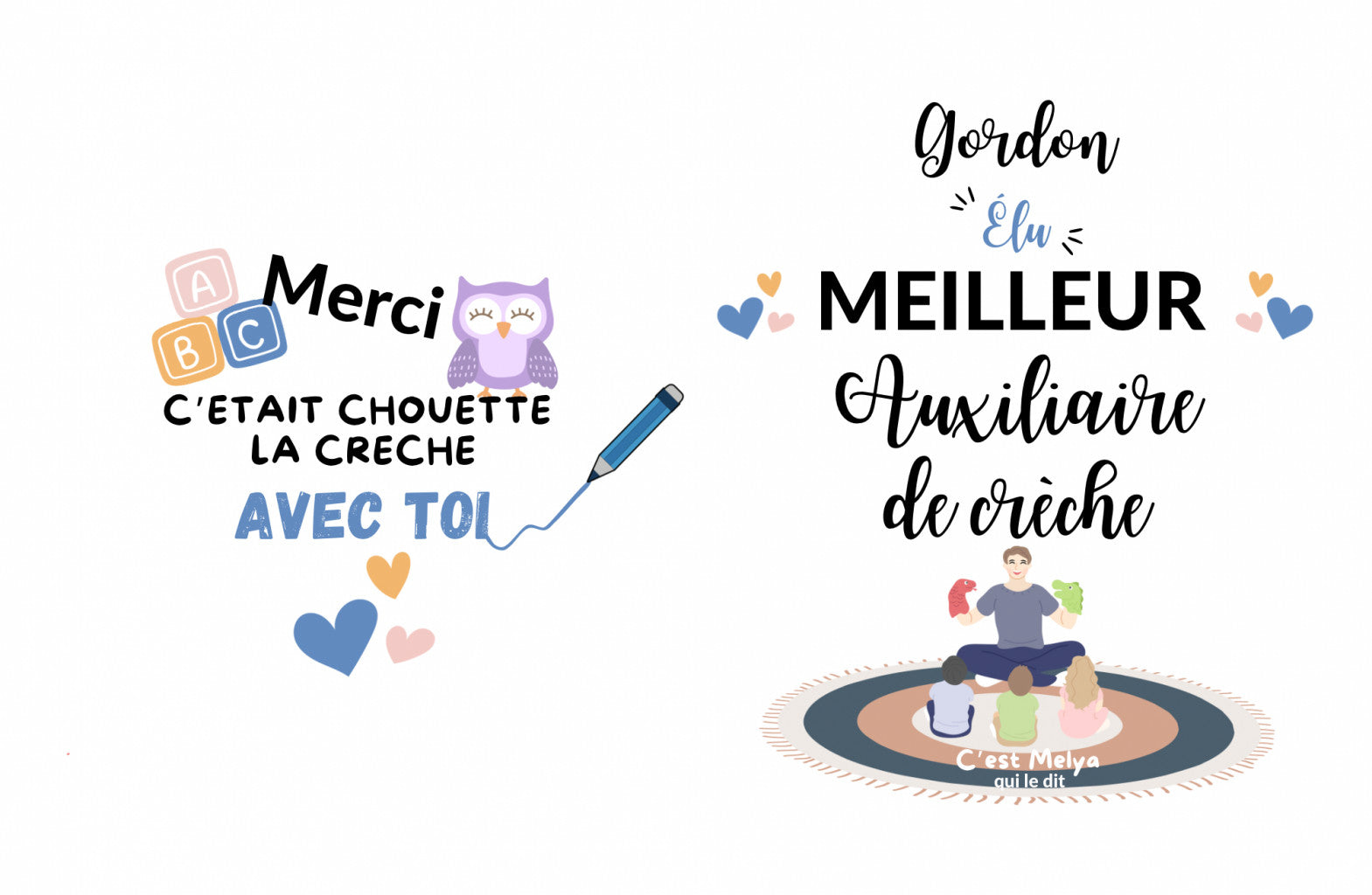 Design fin d’année : préciser le prénom de la personne concernée (nounou, maitresse, astem etc…) ou le nom de l’établissement (nom de la crèche par exemple) puis préciser le nom de l’enfant pour remplir la rubrique « C’est {votre enfant} qui le dit »